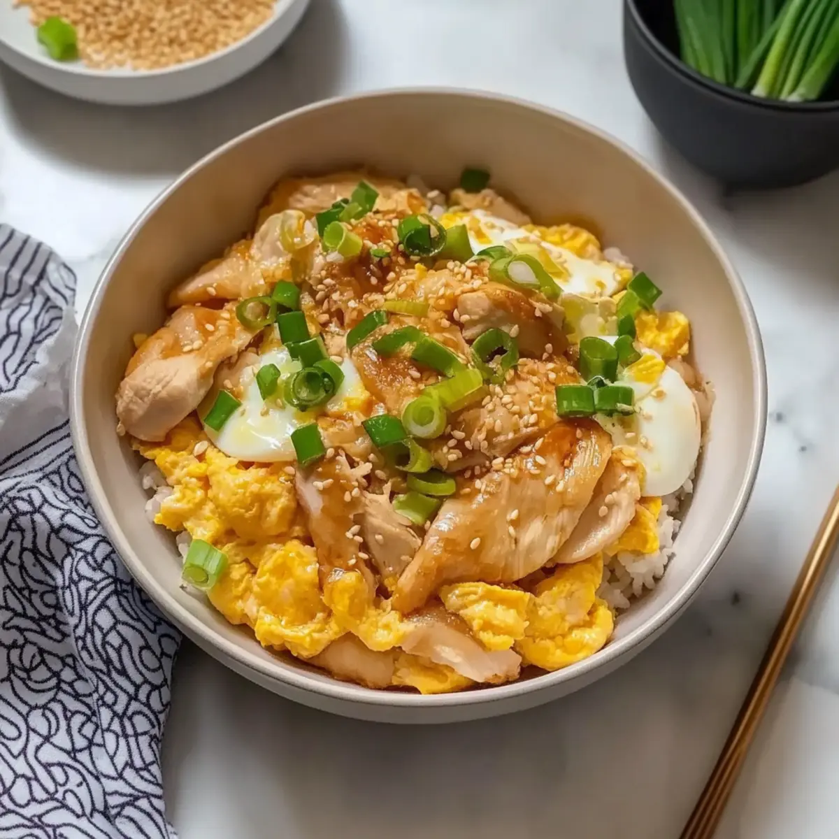 - Scoop cooked white rice into bowls, top with the chicken and egg mixture, and garnish with sliced green onion, sesame seeds, and togarashi.