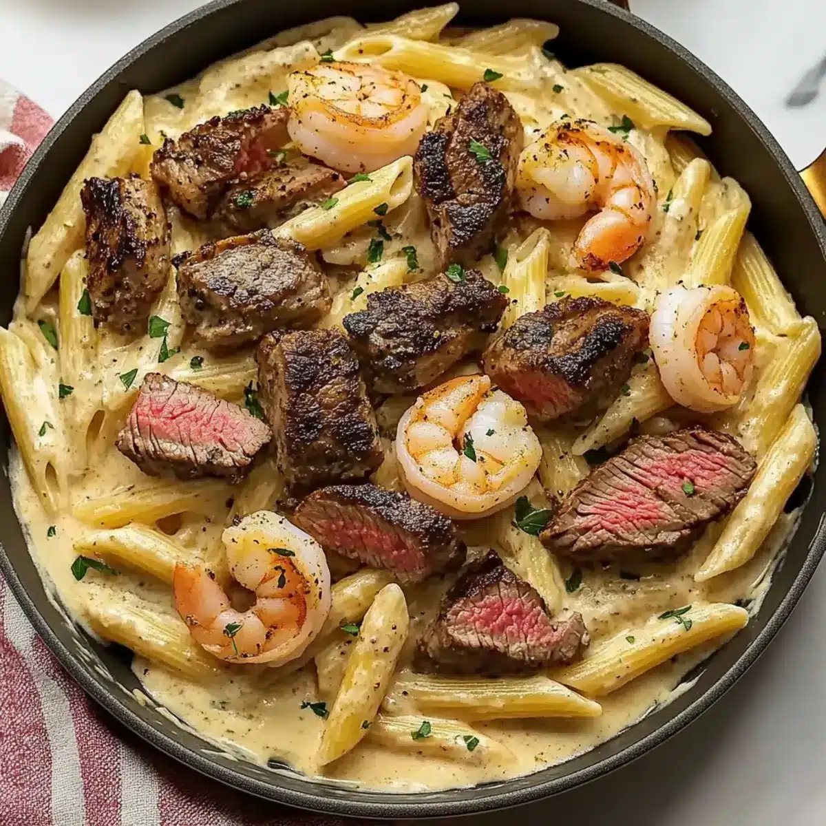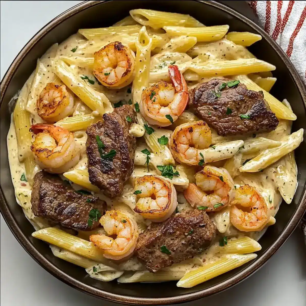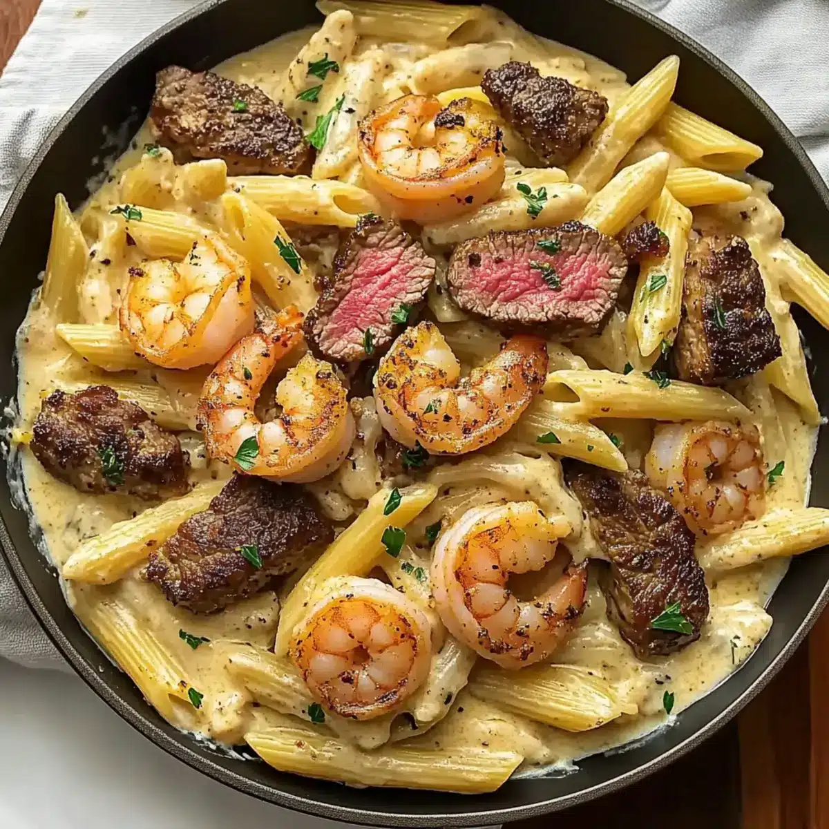 - Combine drained pasta with the sauce, fold in shrimp and steak, garnish with parsley, and serve.