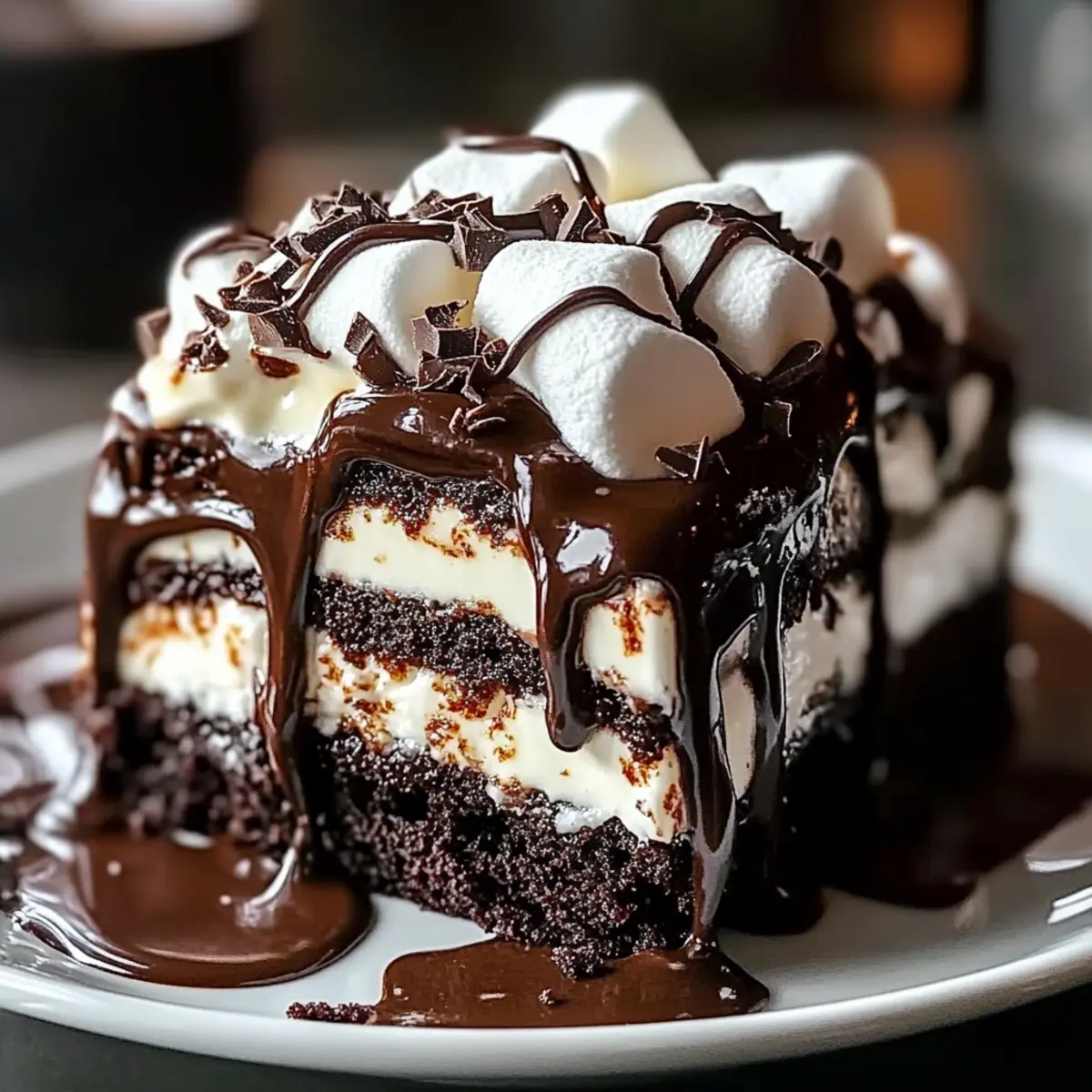 Eye-catching elegance: The glossy ganache drizzle and fluffy marshmallow topping create a stunning dessert that will impress at any gathering.
