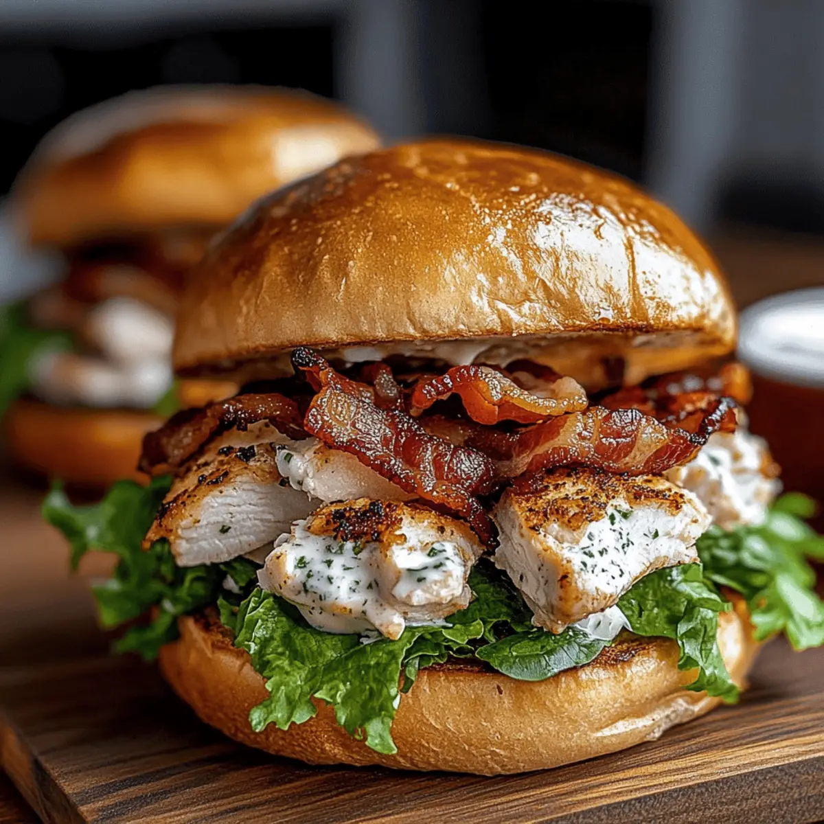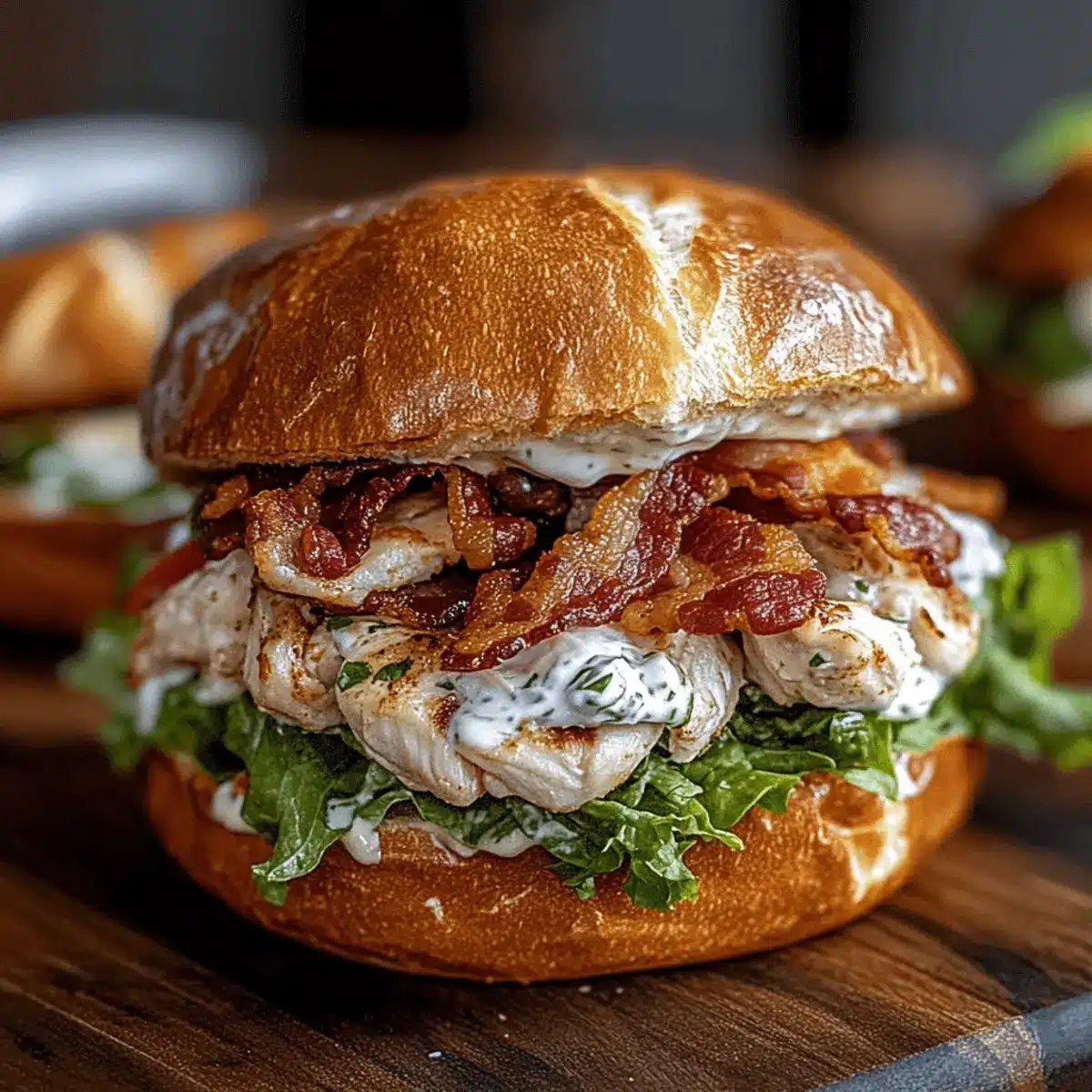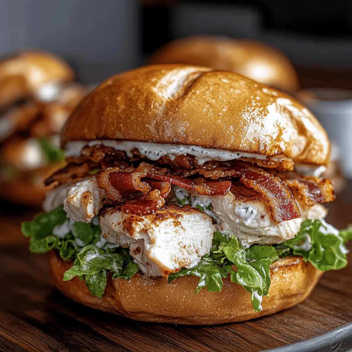 Dynamic Textures: Enjoy the contrast of crispy bacon against juicy chicken and the smooth creaminess of the ranch dressing on a toasted bun!