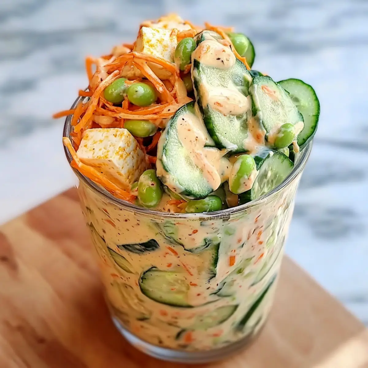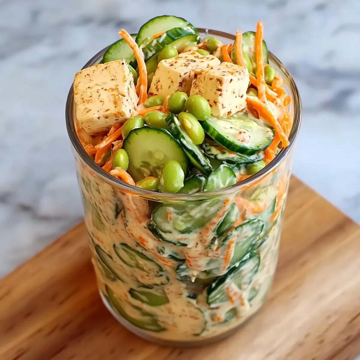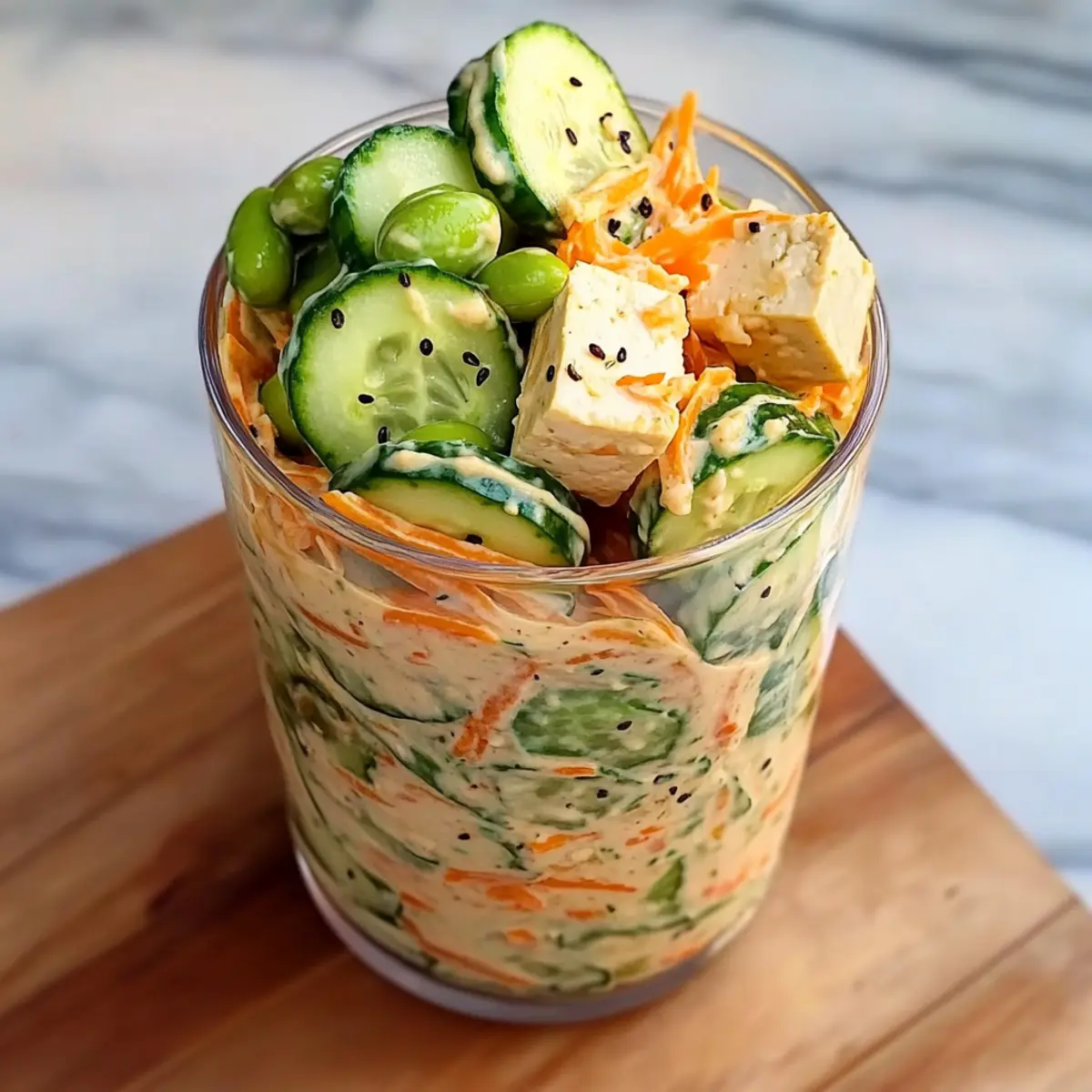 - Begin by preparing your cucumbers; slice them thinly using a cucumber peeler for consistent texture. In a jar or bowl, layer the cucumber slices at the bottom, then gently add the diced tofu, followed by edamame, grated carrot, and chopped spring onion. Press each layer down lightly to ensure they fit well and the salad holds together.