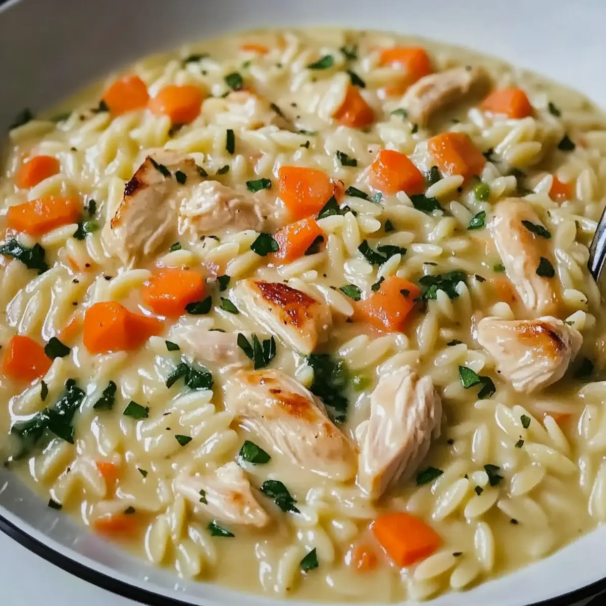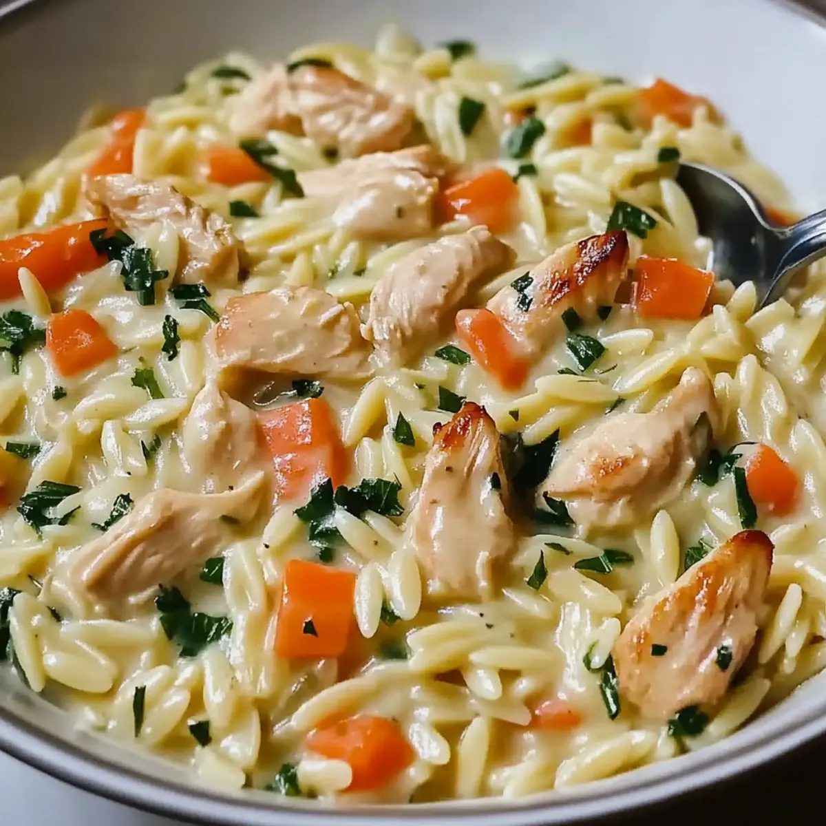 Creamy Comfort: Indulge in a rich, velvety sauce that envelops the tender orzo and succulent chicken, providing warmth in every bite.