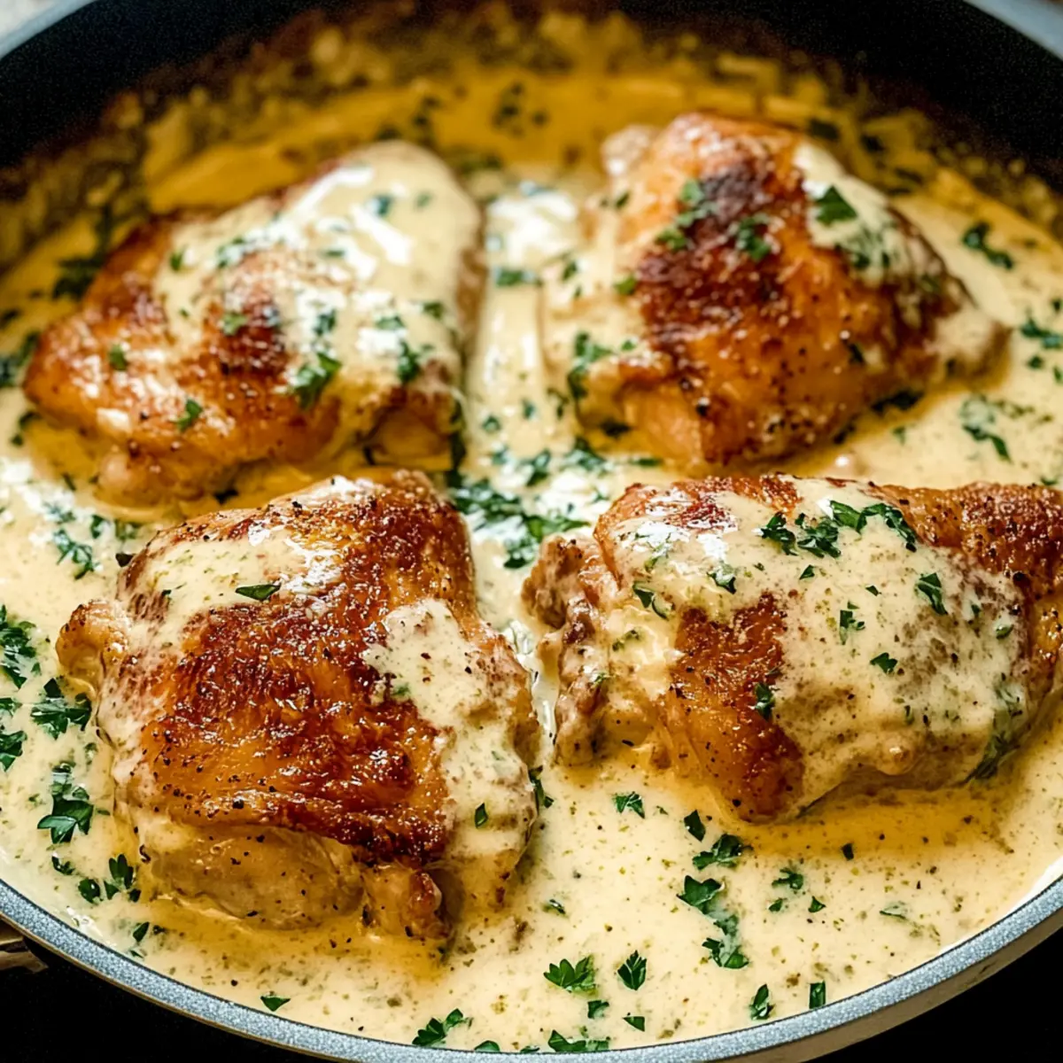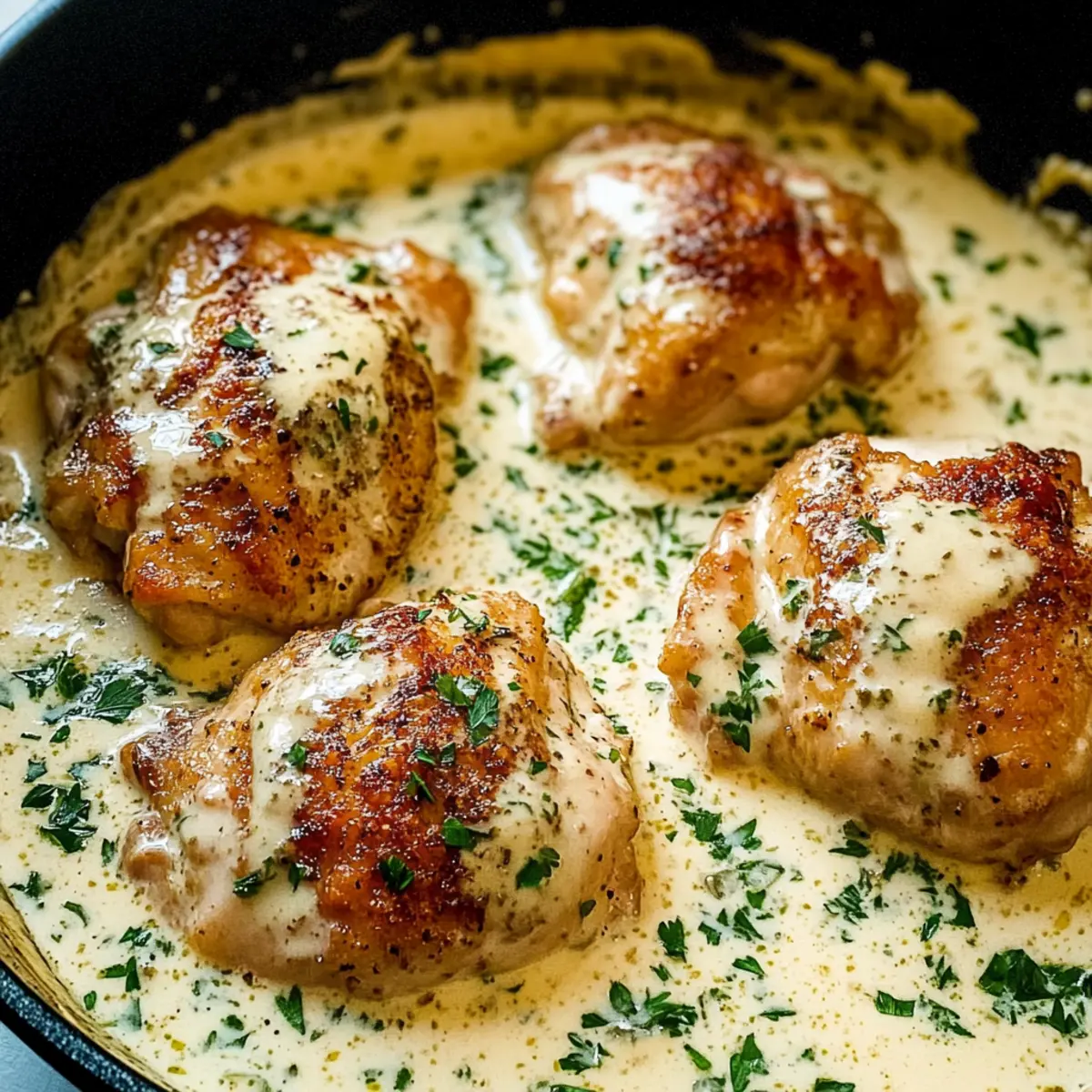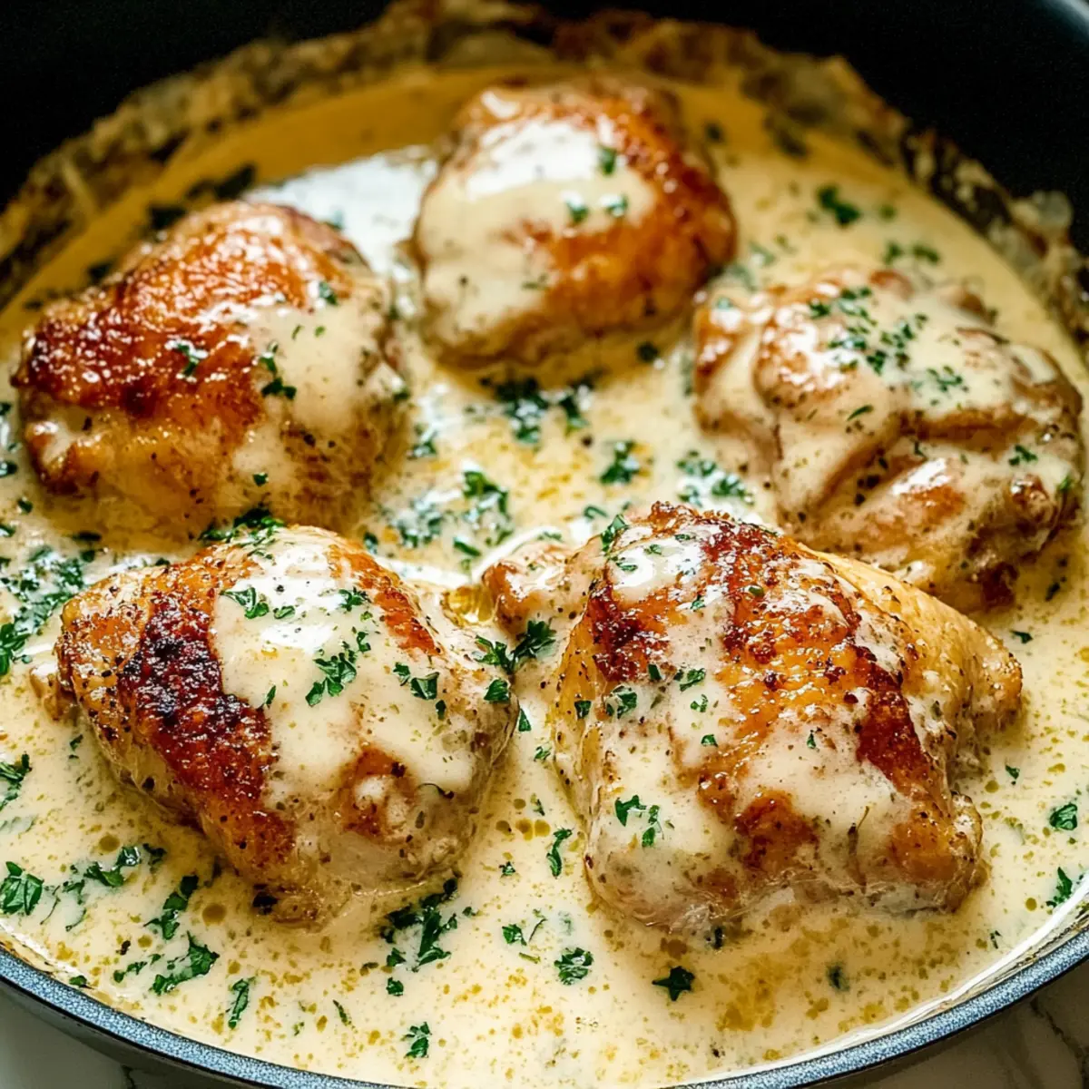 Once done, remove the skillet from the oven and let it sit for a few minutes. Just before serving, garnish the Creamy Oven Baked Chicken Thighs with freshly chopped parsley or dill for a burst of color and freshness. This final touch elevates the dish, making it both inviting and appetizing for your family or guests.