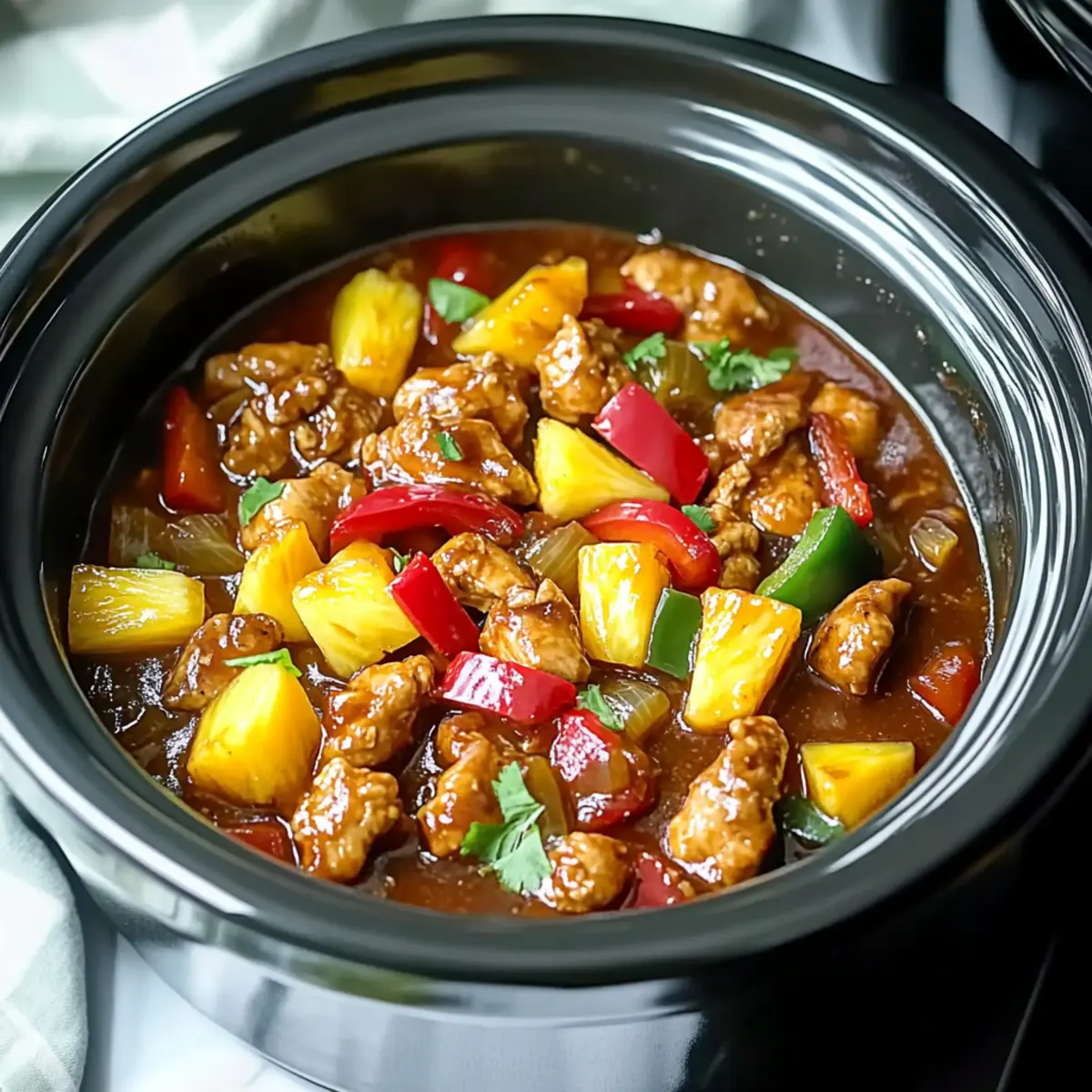About 30 minutes before the cooking time is complete, stir in 1 cup of pineapple chunks and your chopped red and green bell peppers into the crockpot. This will add a fresh crunch and enhanced sweetness to your Crockpot Sweet Hawaiian Chicken, making it even more delightful.
