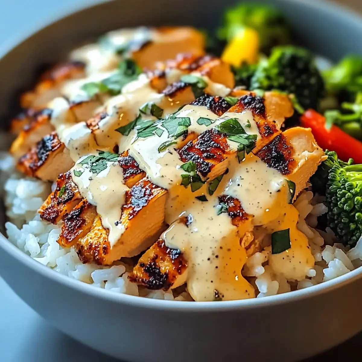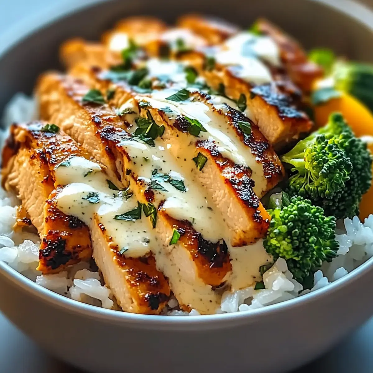 Delicious Easy Chicken & Rice Bowls with Creamy Garlic Sauce Recipe