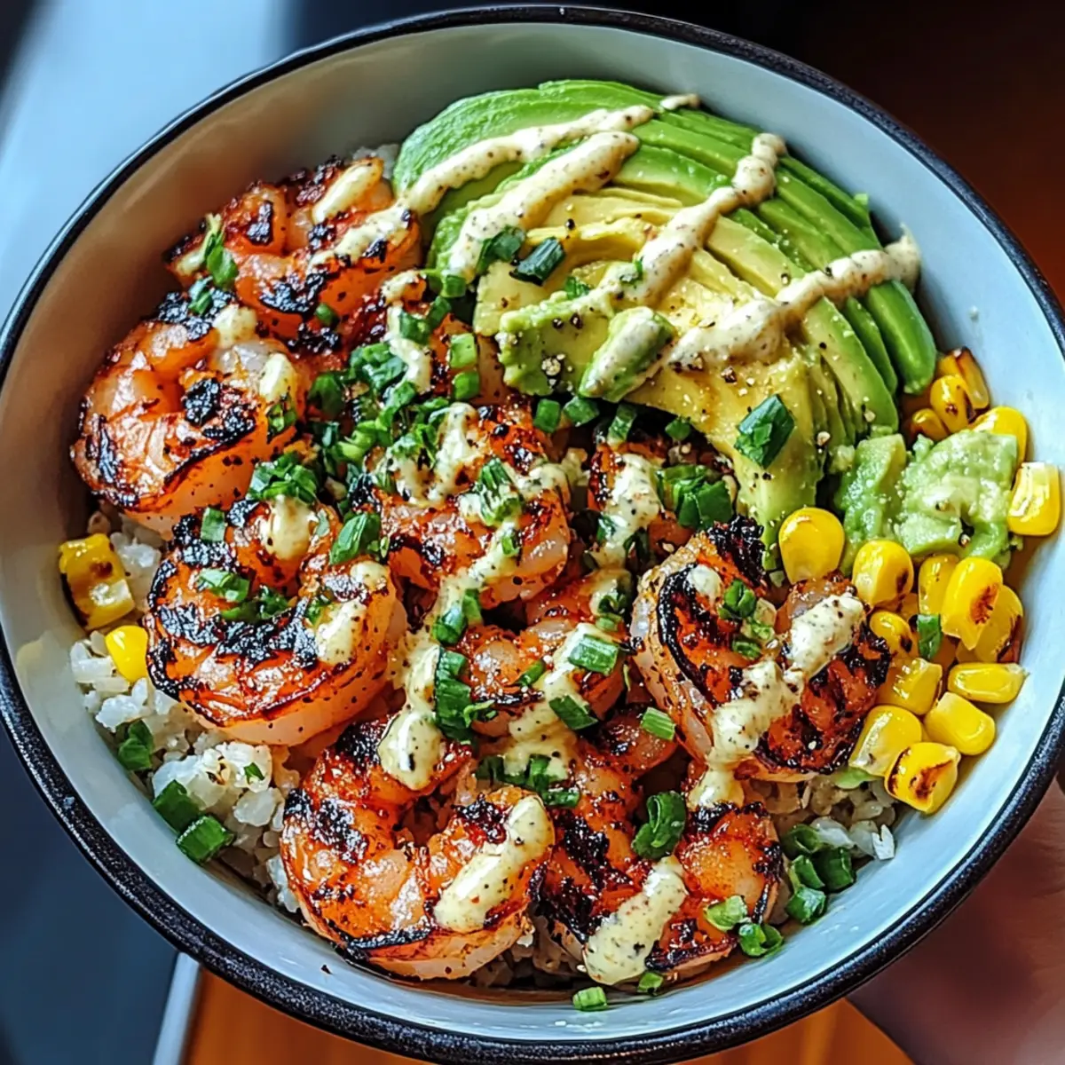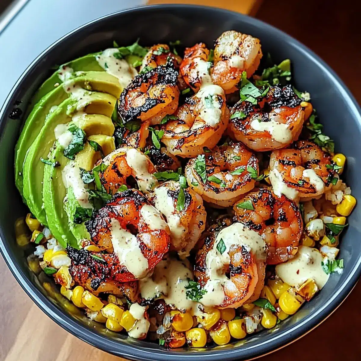In serving bowls, start by dividing the corn salsa evenly, placing it at the base. Top it generously with the freshly grilled shrimp, then add sliced or mashed avocado for creaminess. Drizzle your creamy garlic sauce over the top, finishing with optional garnishes like sesame seeds and chopped green onions for an appealing touch.