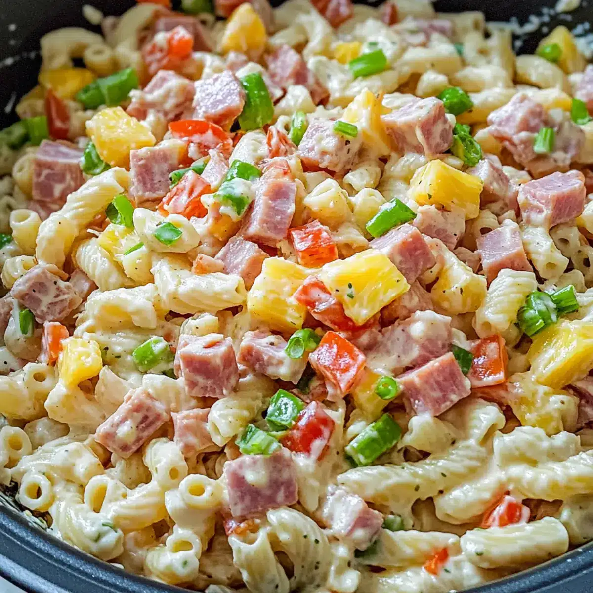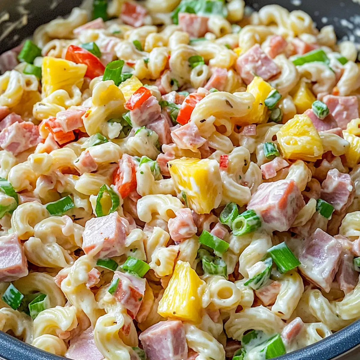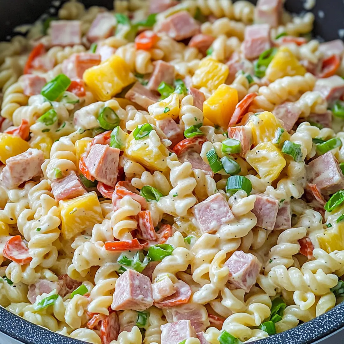- Combine Ingredients: In a large mixing bowl, gently toss together the cooled pasta, diced pineapple, optional diced ham, red bell pepper, grated carrot, grated red onion, and sliced green onion.
