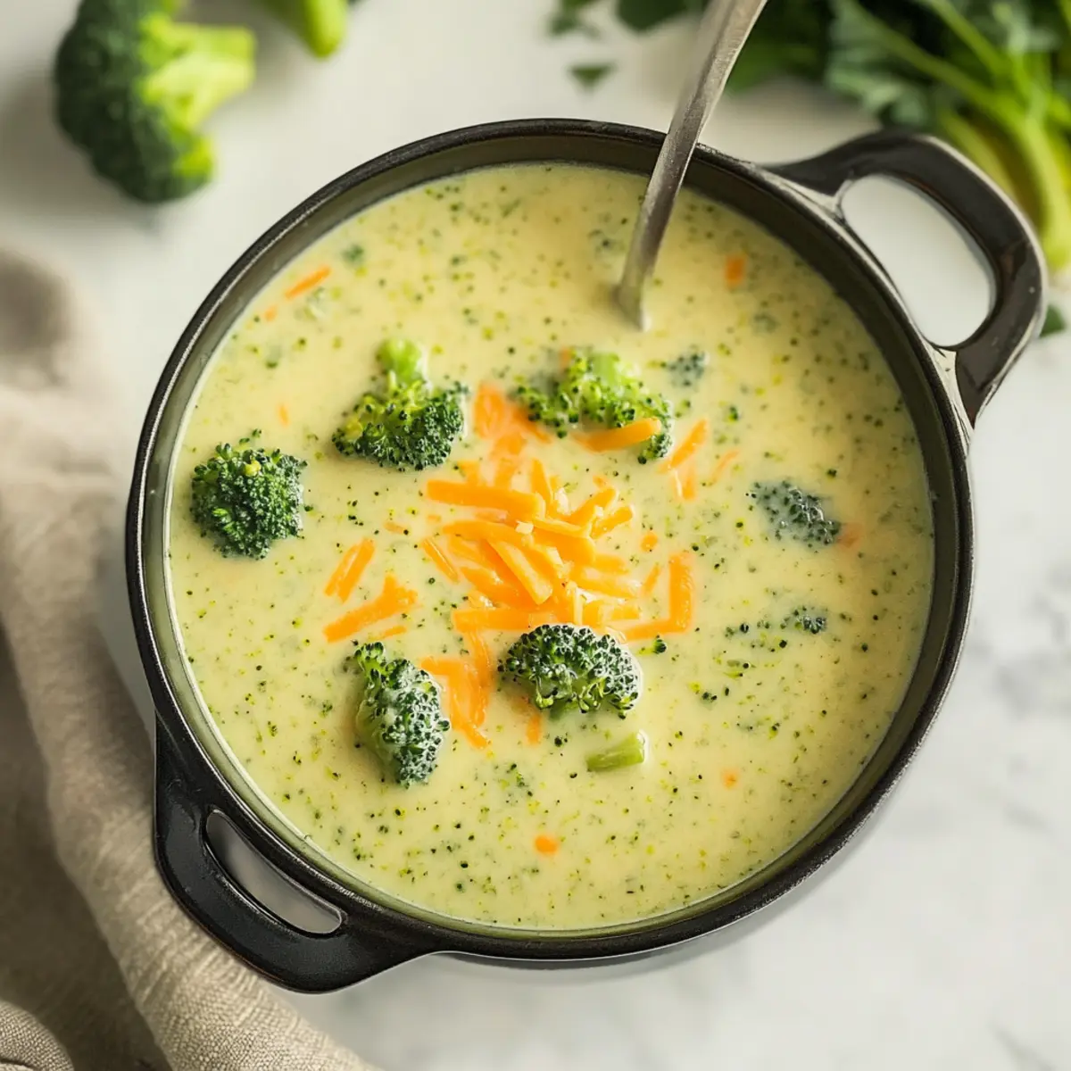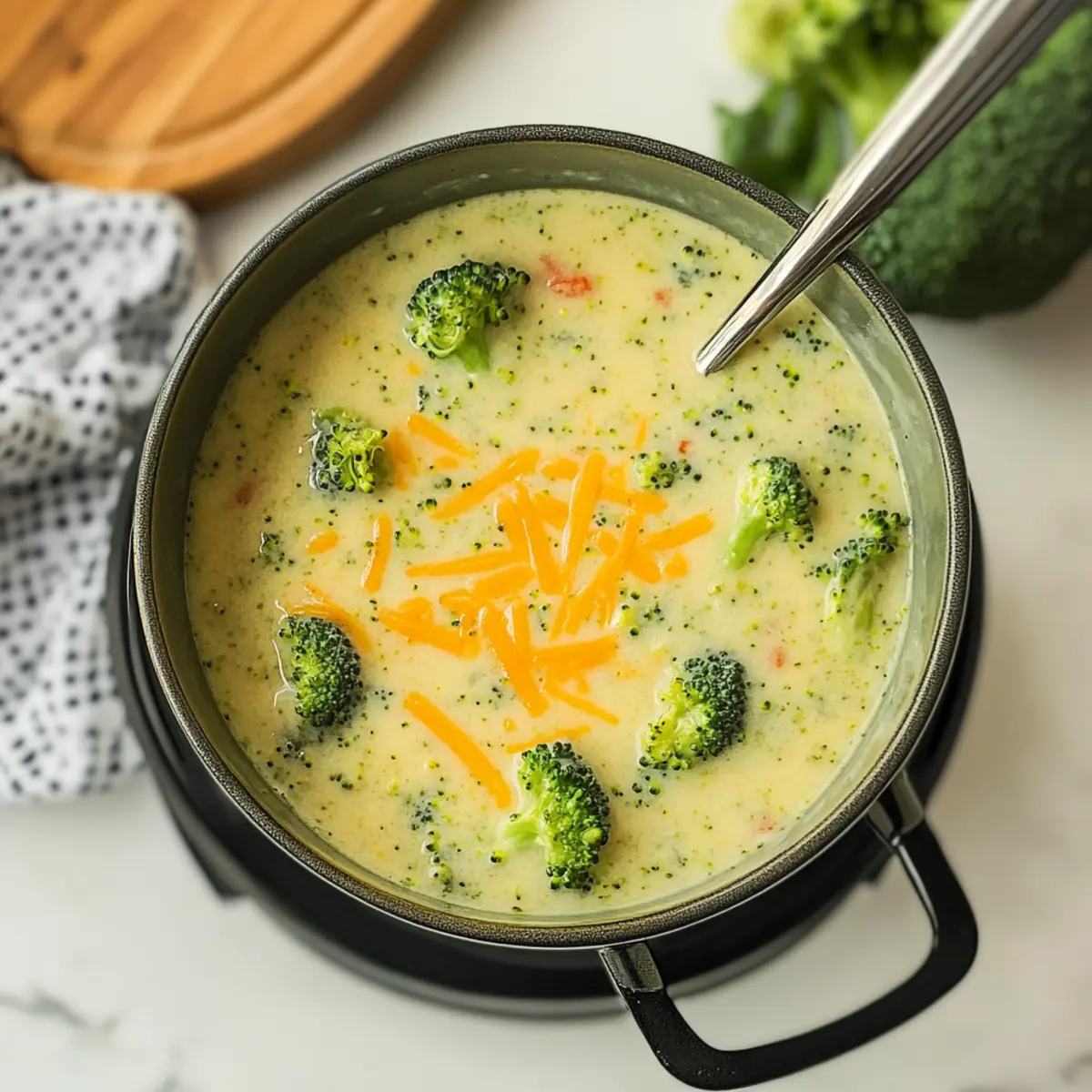 Absolutely! Fresh broccoli is always a great choice for its vibrant flavor and texture. Look for tight, dark green florets without any yellowing or dark spots. Frozen broccoli is a convenient option and should be thawed and drained beforehand to avoid extra moisture in the soup.