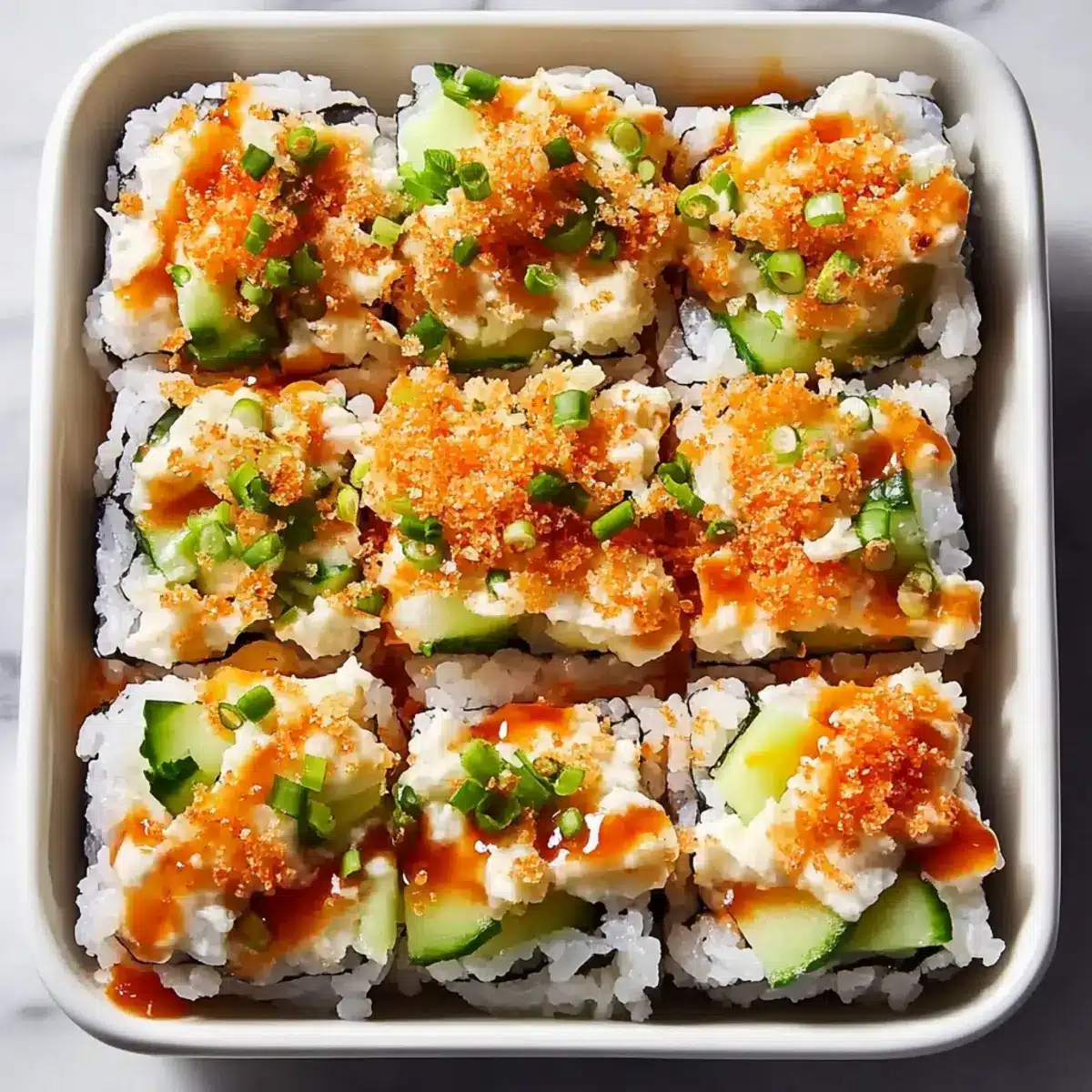 Enhancing flavor can be achieved by adjusting the sriracha in the filling and adding your favorite herbs or spices. Consider adding additional toppings like avocado or seaweed salad for extra flair, or serve with a dipping sauce to elevate your sushi bake experience!