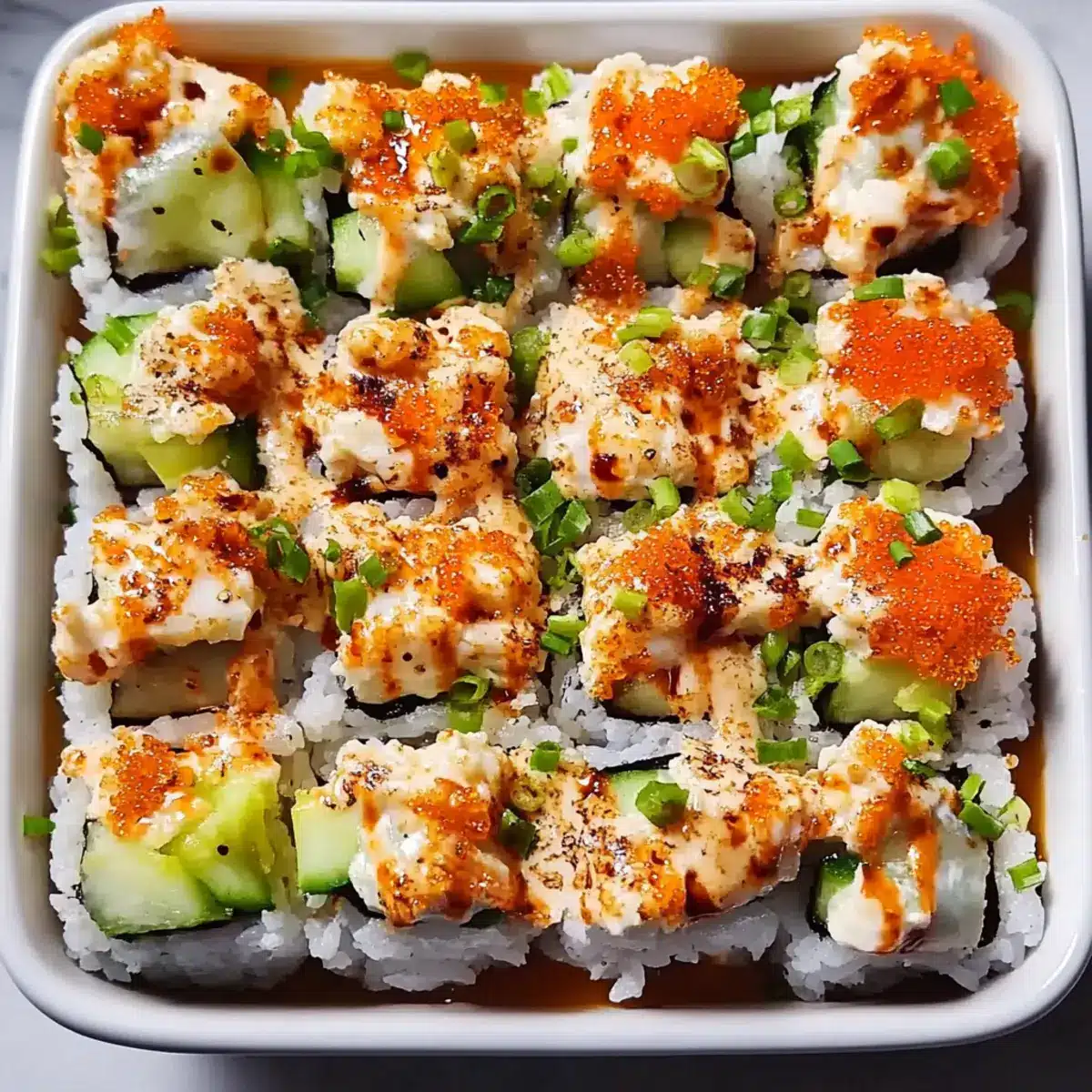 After broiling, take the dish out of the oven and allow it to cool for a couple of minutes. Drizzle generously with spicy mayo and unagi sauce to enhance the flavors. For a refreshing contrast, garnish with chopped cucumber and green onions, inviting a delightful crunch to your Irresistibly Easy Sushi Bake.