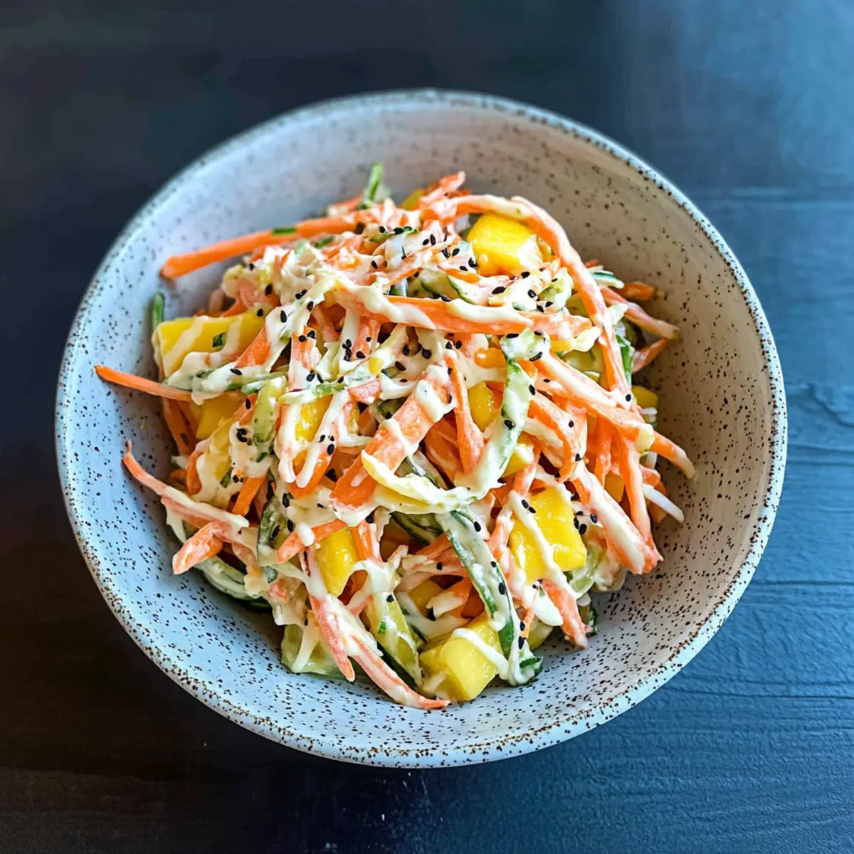 - Combine the crab strands, julienned mango, carrot, and cucumber in a large mixing bowl. Pour the dressing over and gently toss.