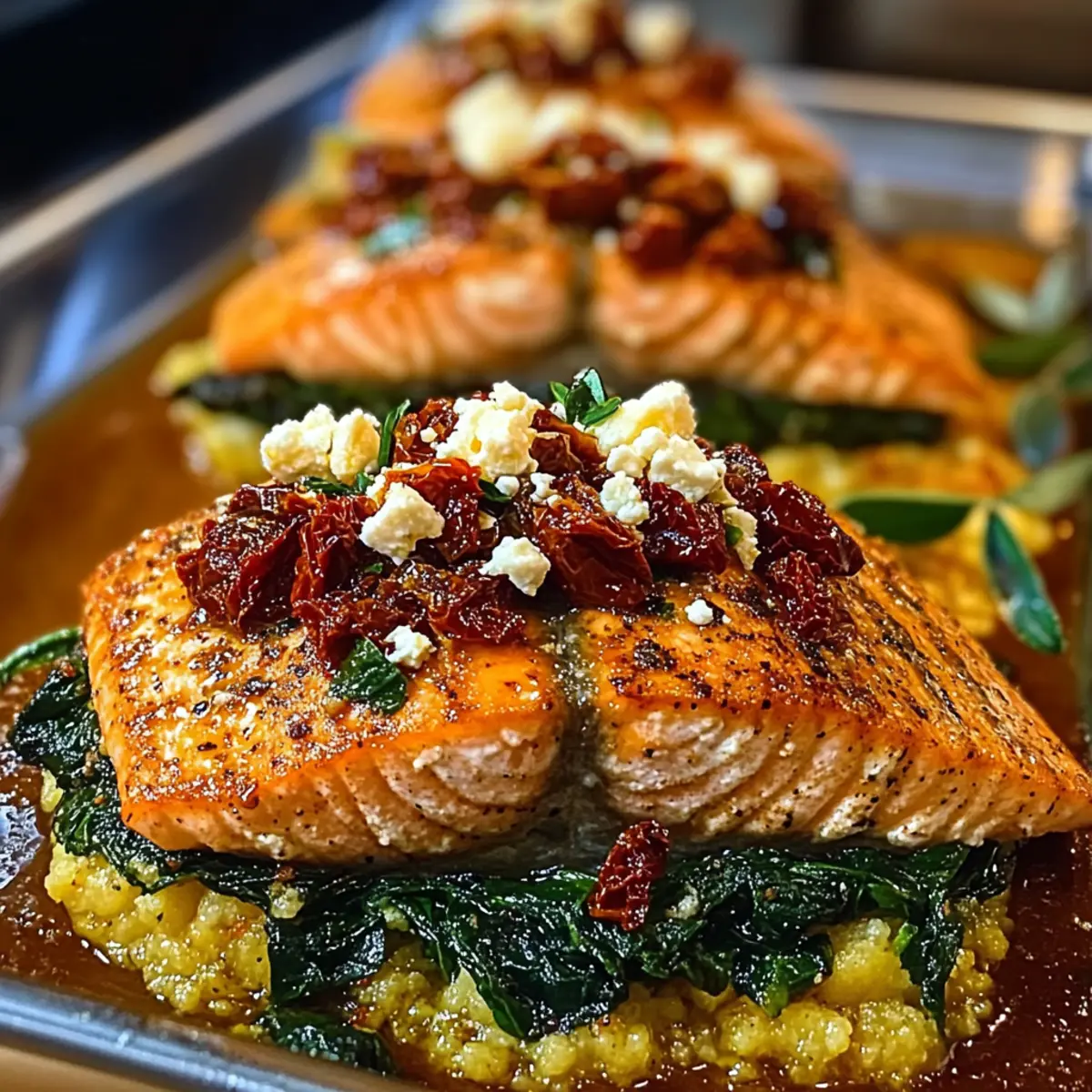 Once baked to perfection, remove the Mediterranean Stuffed Salmon from the oven and let it rest for a minute. Squeeze fresh lemon juice generously over each fillet just before serving to brighten up the rich flavors. The acidity of the lemon will elevate the dish, making it simply irresistible.