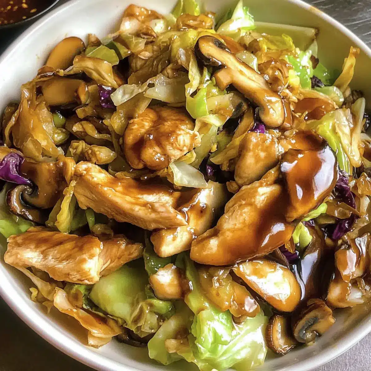 Flavor Explosion: This dish brings together tender chicken with earthy mushrooms and crunchy cabbage, all dancing in a sweet and savory hoisin sauce that tantalizes the taste buds.