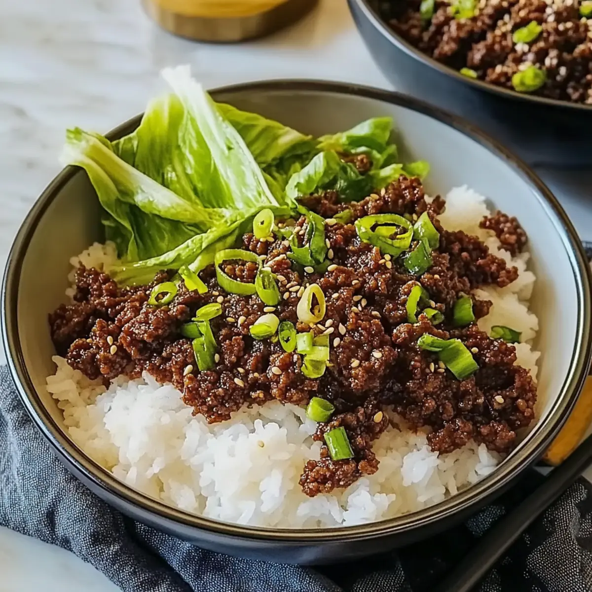 Spoon the savory beef mixture over 2 cups of warm cooked jasmine rice. Make sure each serving is generous, allowing the flavors to shine through. Finally, garnish your bowl with sliced green onions and a sprinkle of sesame seeds for added texture and crunch. This finishing touch will elevate your Quick and Easy Korean Ground Beef Bowl into a vibrant, satisfying meal.