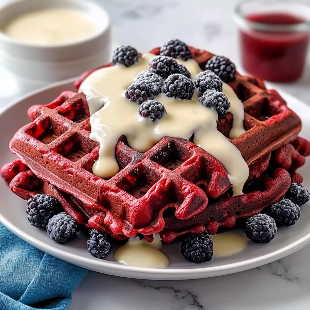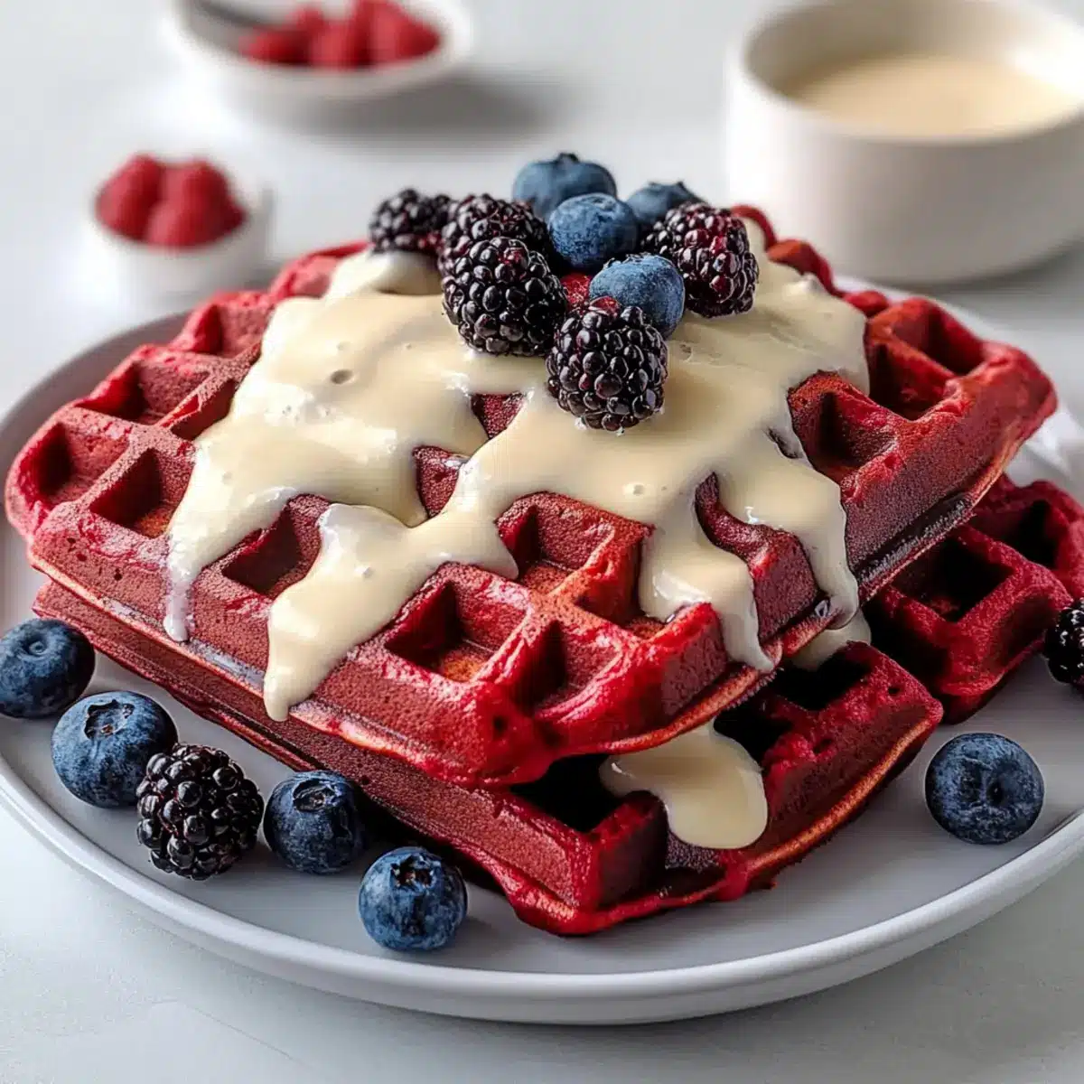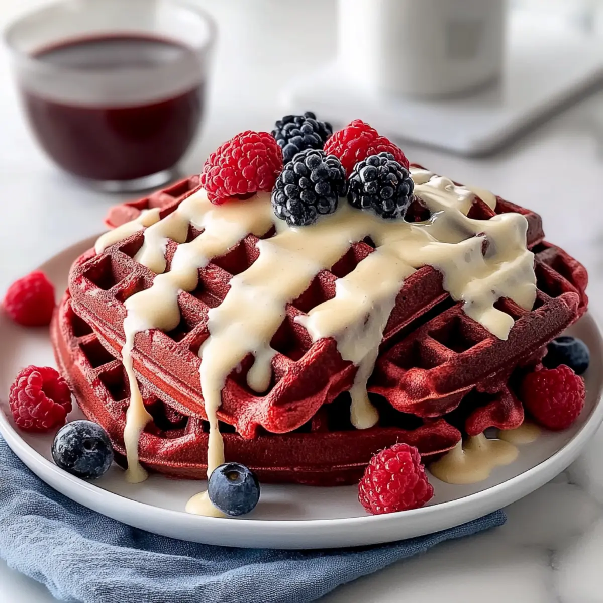 Carefully transfer the freshly made Red Velvet Waffles to a plate. Drizzle a generous amount of your cream cheese glaze over the top while they’re still warm. For a festive touch, consider adding fresh berries or a dusting of powdered sugar before serving. Enjoy your delicious creation right away!