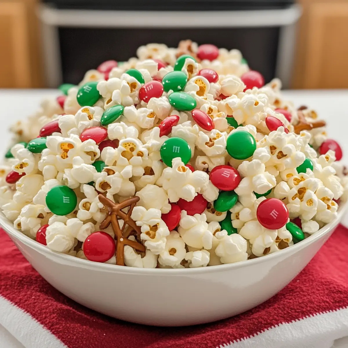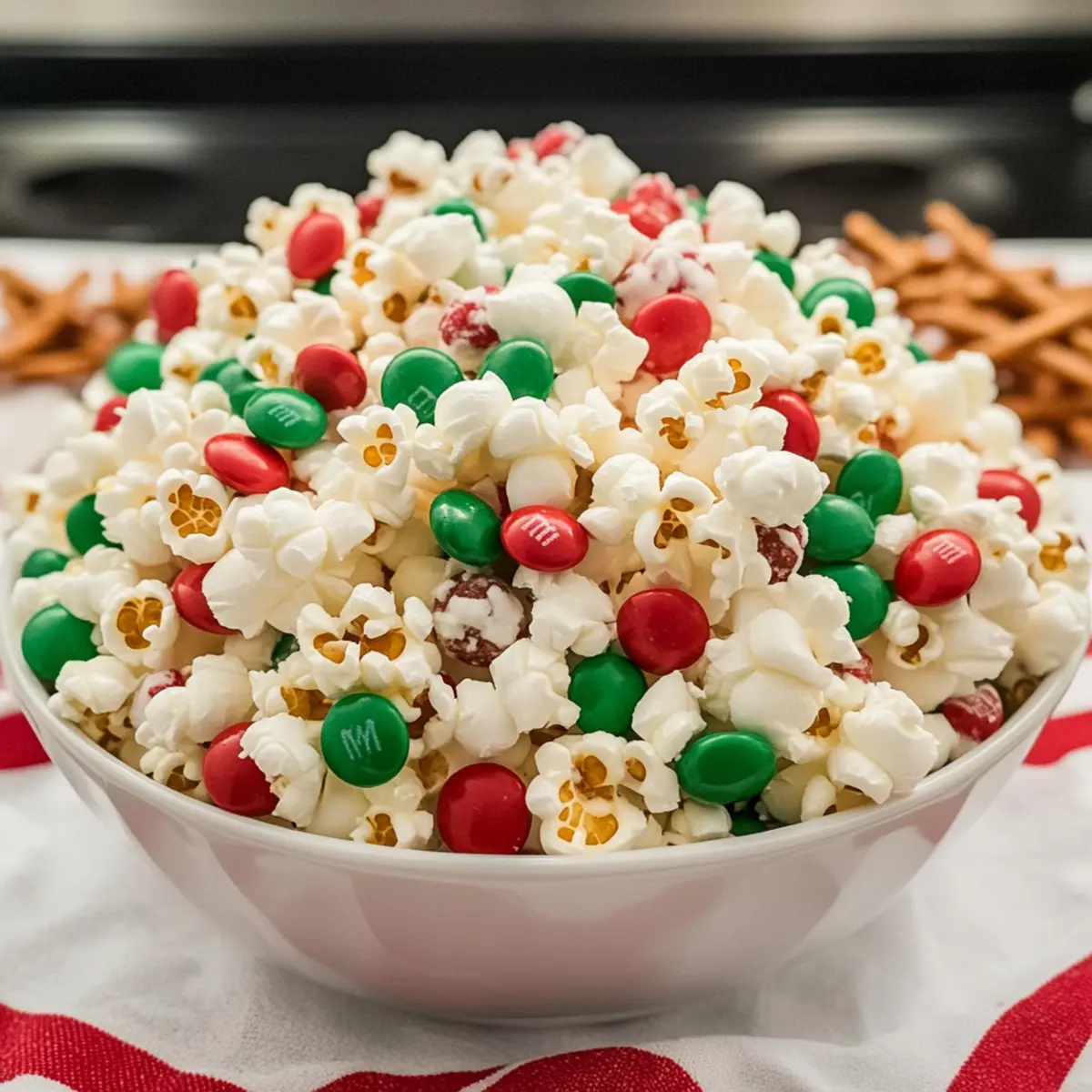 - While the popcorn is still warm, sprinkle a mix of red and green M&Ms, pretzel M&Ms, additional mini marshmallows, and colorful Christmas sprinkles over the surface.