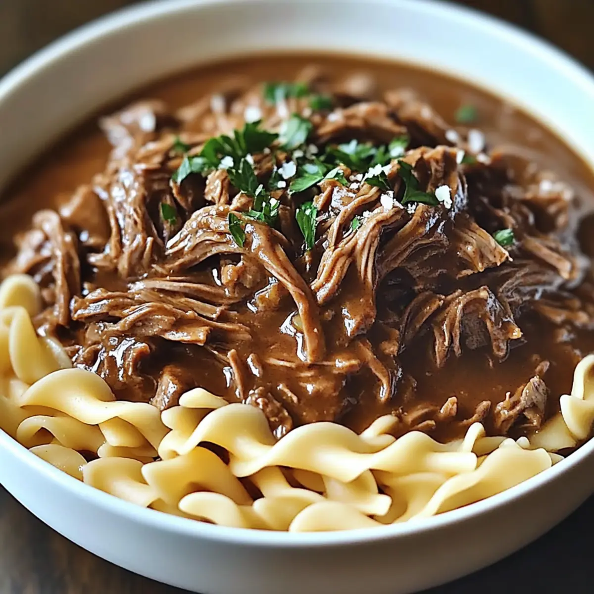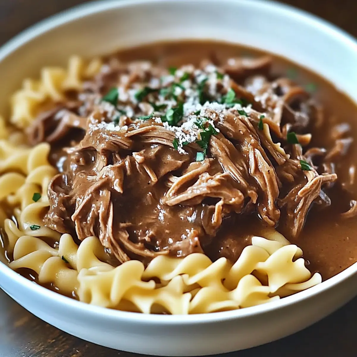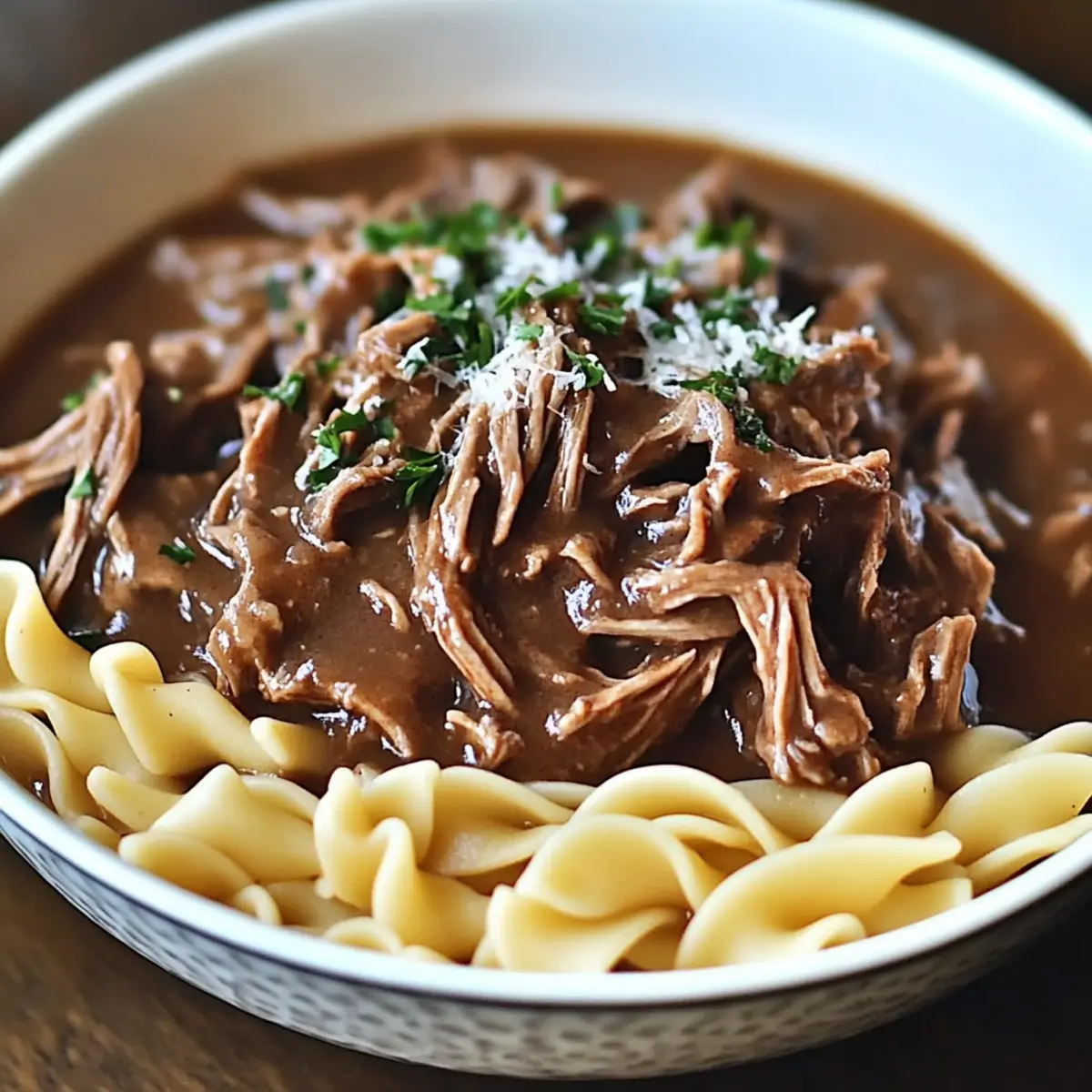 Carefully remove the roast from the slow cooker and shred it using two forks, mixing it back into the broth. Serve this tender beef mixture over the warm egg noodles, ensuring each bite is packed with flavor. The comforting aroma will draw your family to the table.