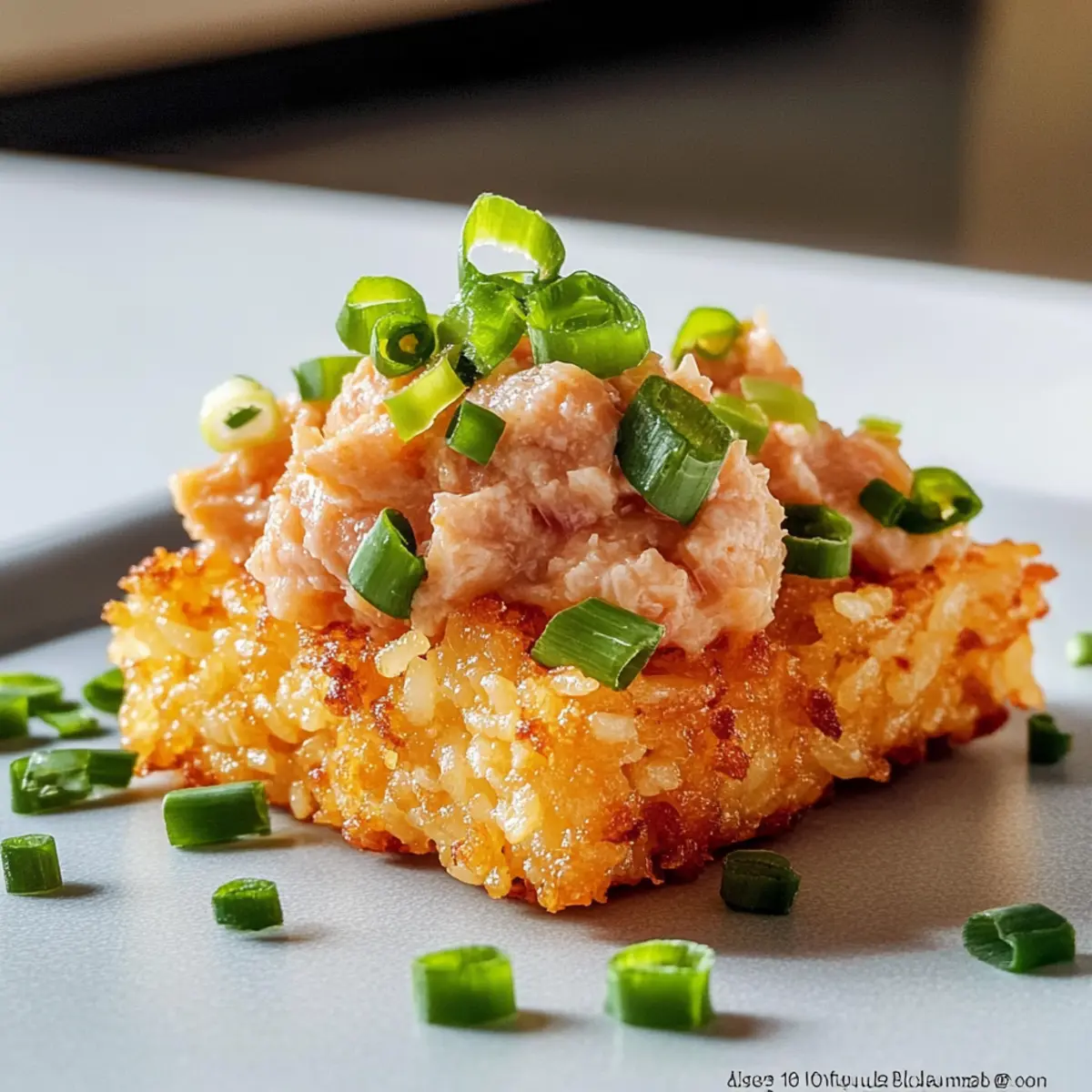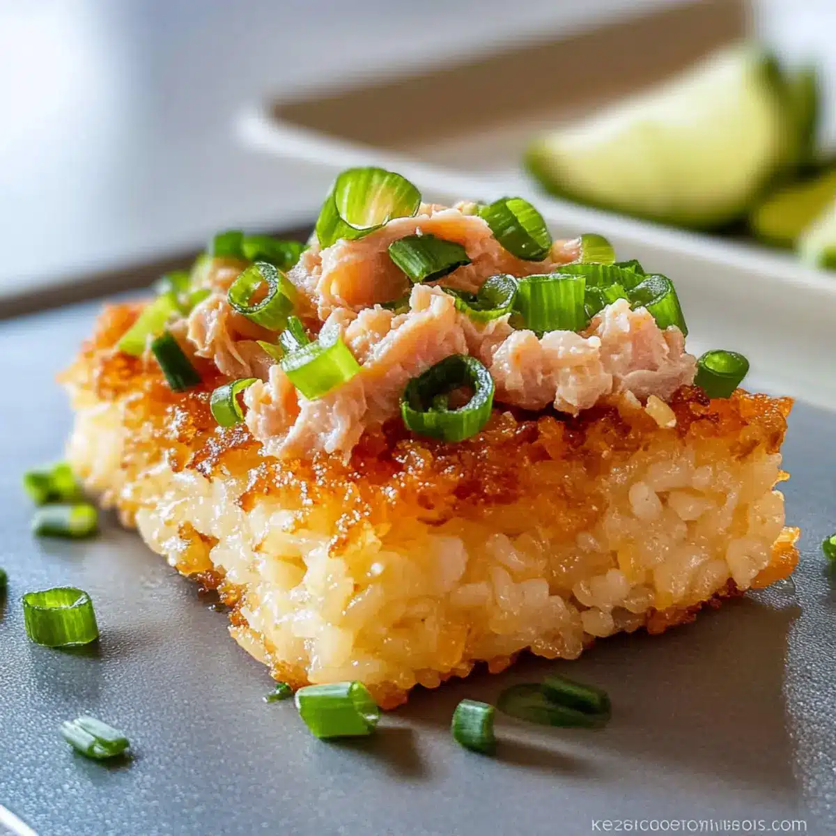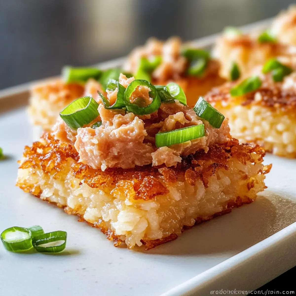 Reheating: To reheat, bake the rice blocks in a preheated oven at 350°F (175°C) for about 10-15 minutes until crispy again before topping with the fresh tuna mixture.