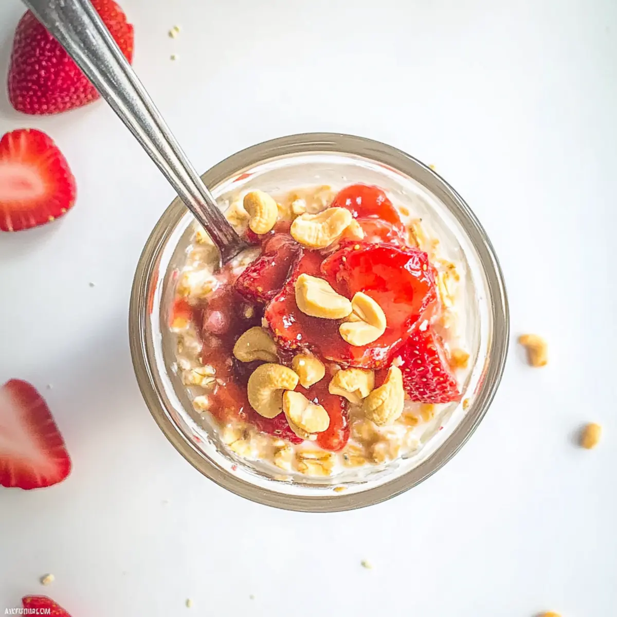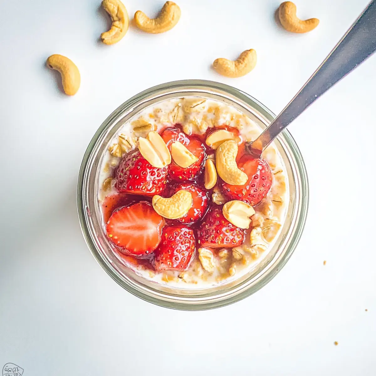 These Strawberry Cheesecake Overnight Oats are perfect for meal prep enthusiasts! You can mix the yogurt base—1 cup of plain Greek yogurt, 2 tablespoons of honey (or maple syrup), and 2 tablespoons of fresh lemon juice—up to 24 hours in advance to save time. Additionally, the oats (1 cup of old-fashioned rolled oats and 2 tablespoons of ground flaxseed or chia seeds) can be combined with the yogurt mix ahead, just be sure to layer your sliced strawberries right before serving to keep them fresh. Store in an airtight container in the refrigerator for up to 5 days. The key is to add the roasted cashews last to maintain their crunch, ensuring your breakfast remains just as delicious as when freshly made!