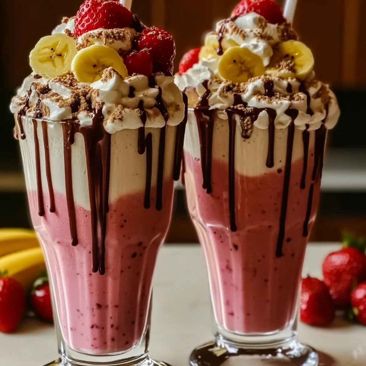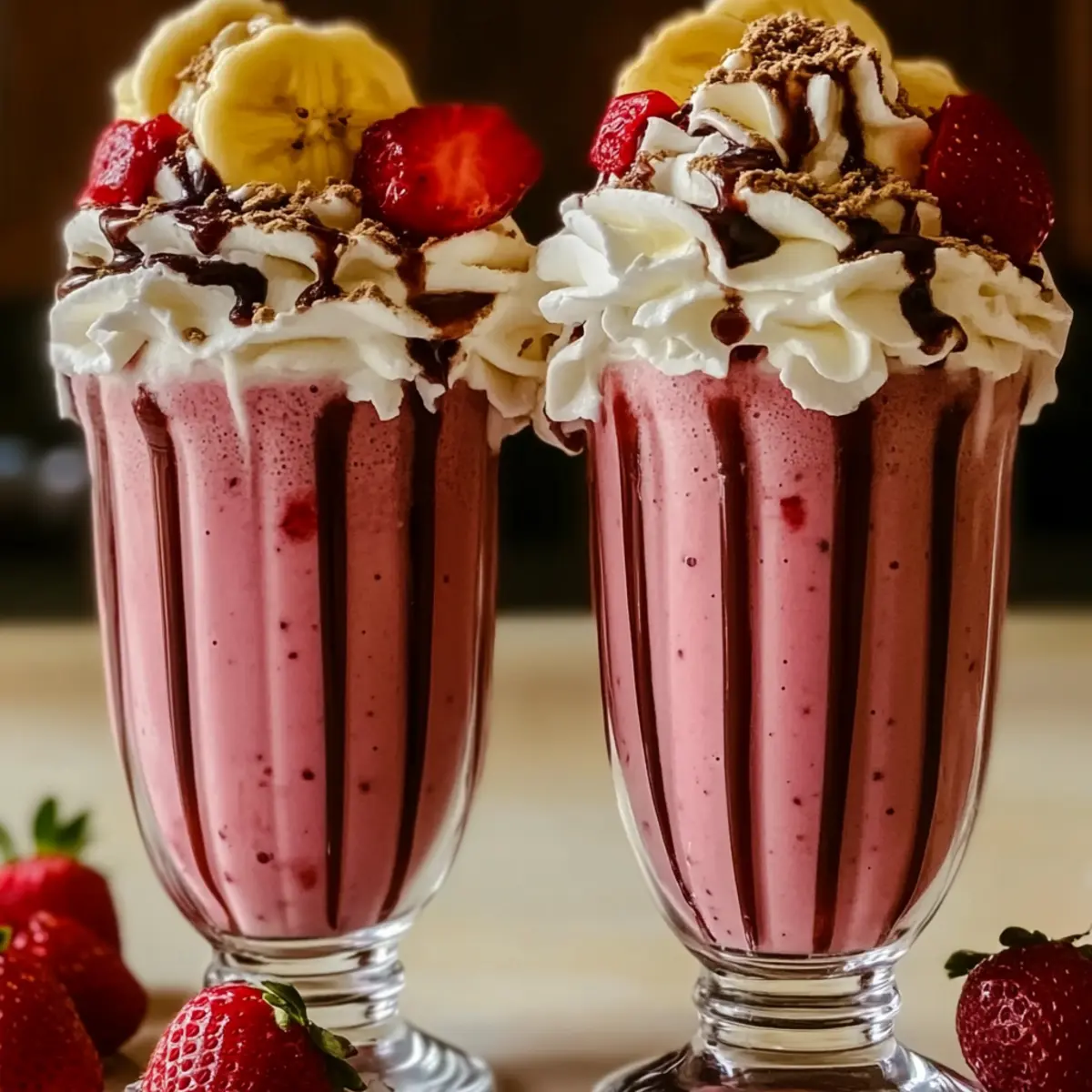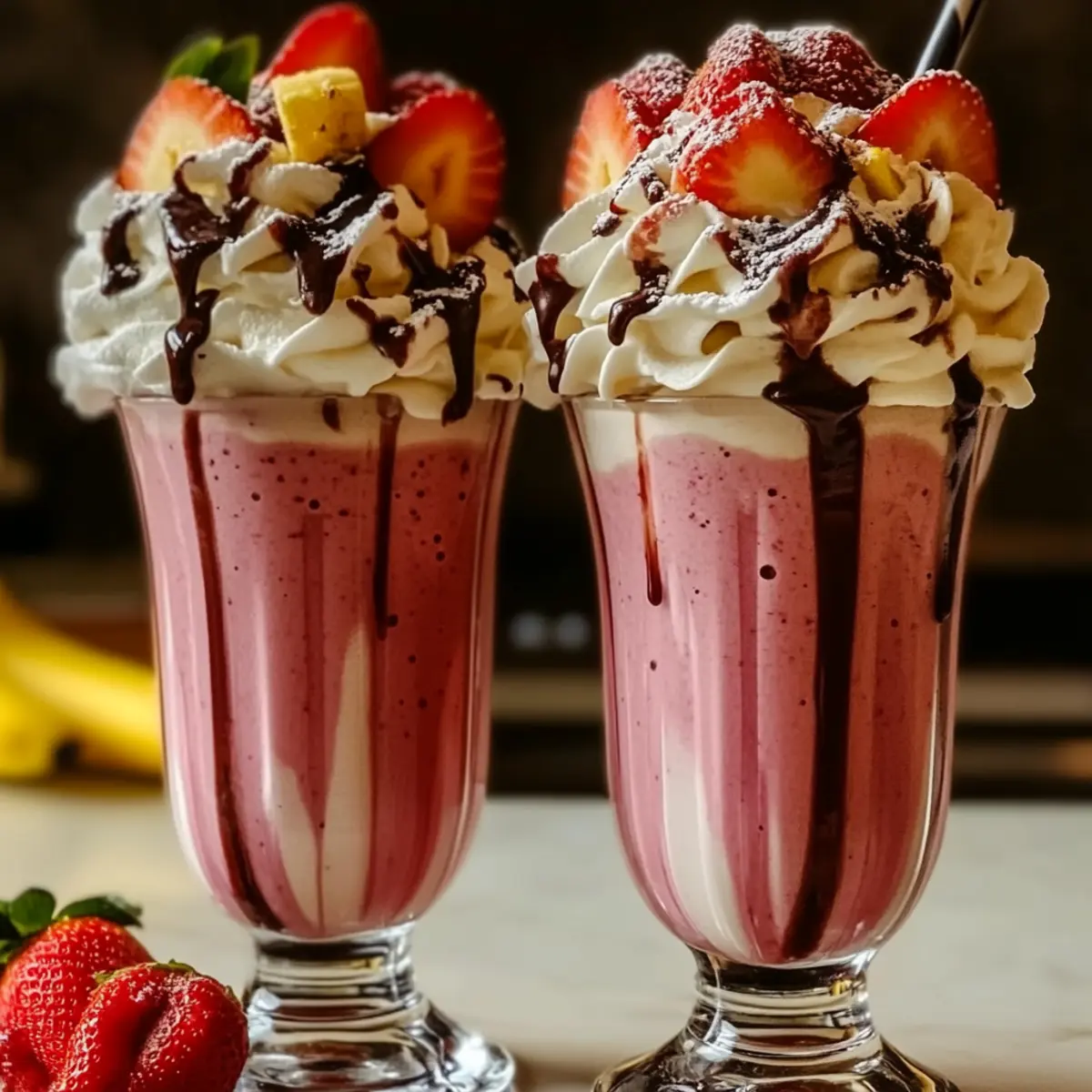 Carefully pour the creamy shake into the prepared glasses, allowing the vibrant colors to shine through. Top each glass with a generous dollop of whipped cream, creating a beautiful crown. For added fun, sprinkle your choice of toppings like crushed nuts or chocolate shavings, and finish with a fresh strawberry perched on the rim for that perfect touch.